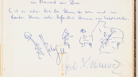 The story of Musica Viva Australia’s early years is woven throughout the guest book. From the mid-1950s, the Wenkarts’ home was a venue for numerous recitals and garden parties for the organisation. Here chamber music was presented in its truest sense and setting — in the home, as the word ‘chamber’ originally implied. Goldner’s appreciation is evident from his entry in 1980: